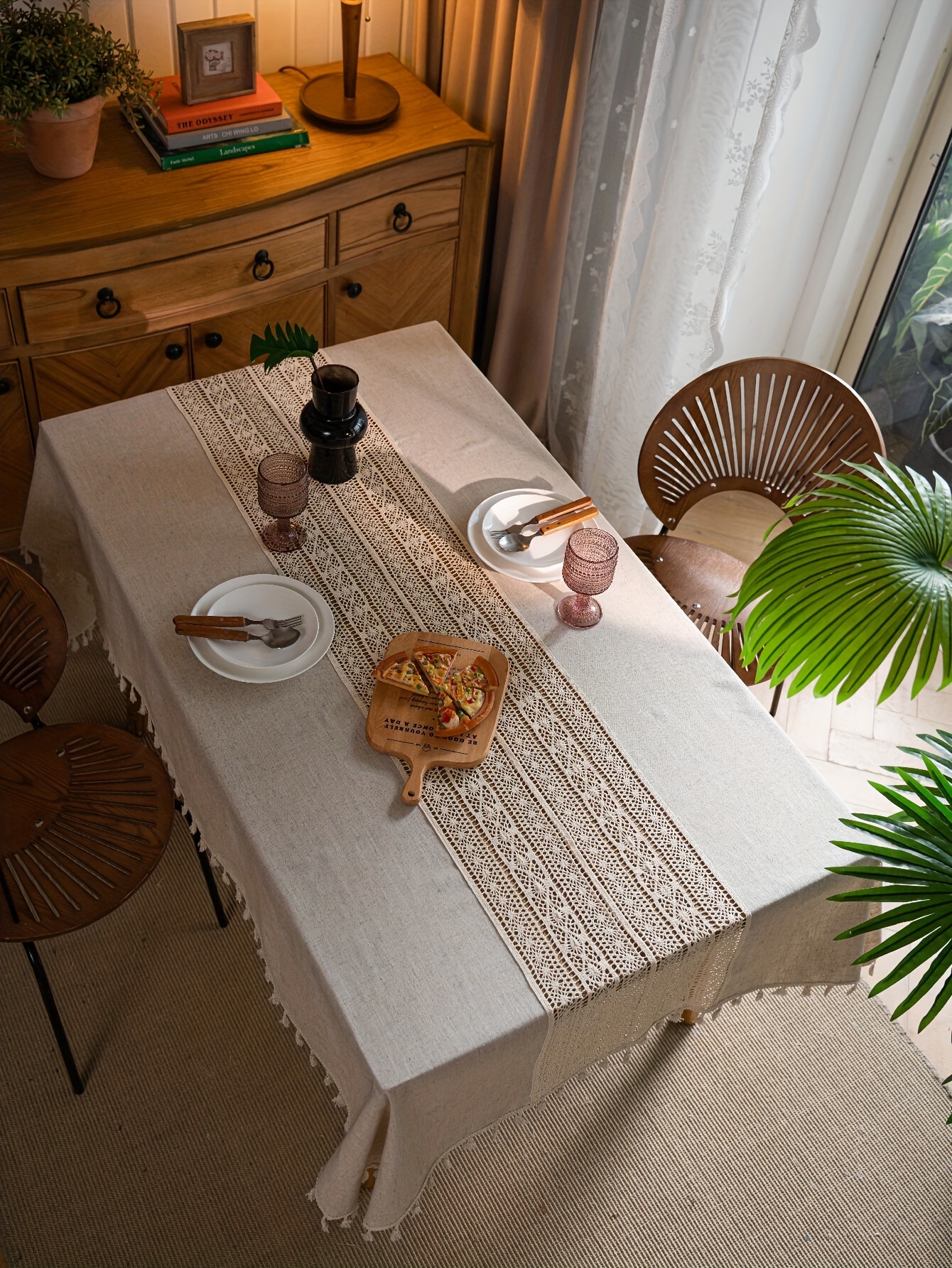 Grâce à sa composition mélangée, cette nappe conjugue la douceur du lin naturel à la résistance et à la facilité d’entretien du polyester. Les finitions ajourées et les franges apportent une dimension artisanale inspirée du style bohème chic, tout en assurant une grande robustesse pour un usage quotidien. Sa forme carrée et ses teintes beiges s’adaptent parfaitement à tous les styles de décoration, du champêtre au contemporain.
