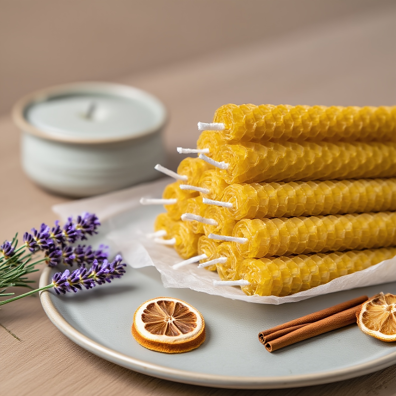Ensemble de 20 bougies artisanales en cire d’abeille avec texture en nid d’abeille . Bougies effilées élégantes . Combustion propre et longue durée.