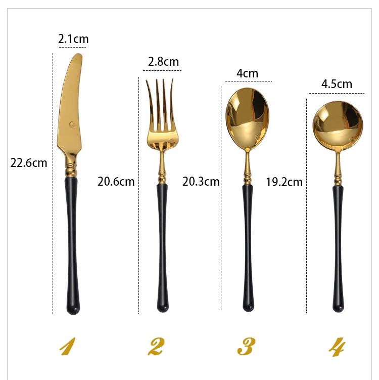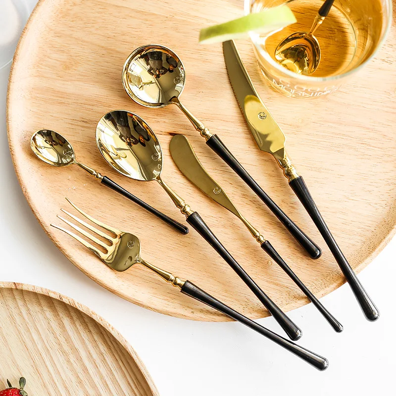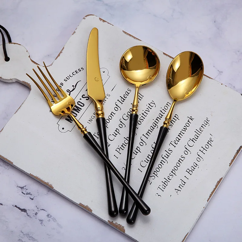 Couverts de cuisine en acier inoxydable doré , ensemble de couverts pour steak, café, dessert, vaisselle avec manche noir, couteau , fourchette et cuillère