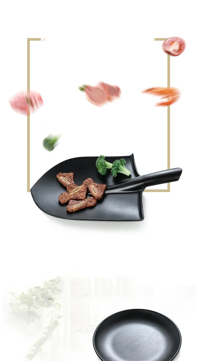 Assiette créative noire en mélamine, modèle pelle assiettes de barbecue pour restaurant, salade ou dîner