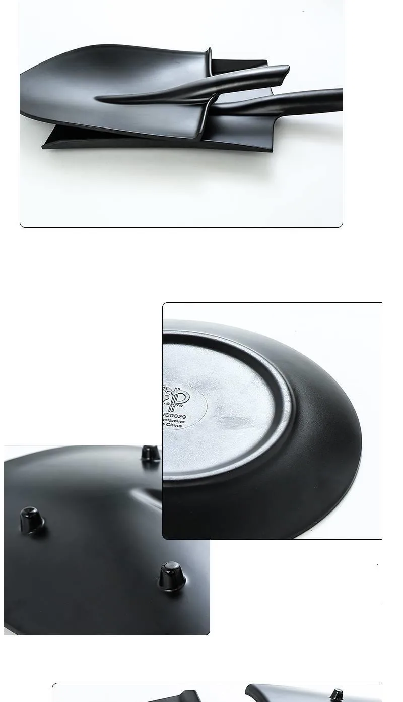 Assiette créative en mélamine noire, design pelle — Parfaites pour le barbecue, le service de grillades et les dîners conviviaux !
