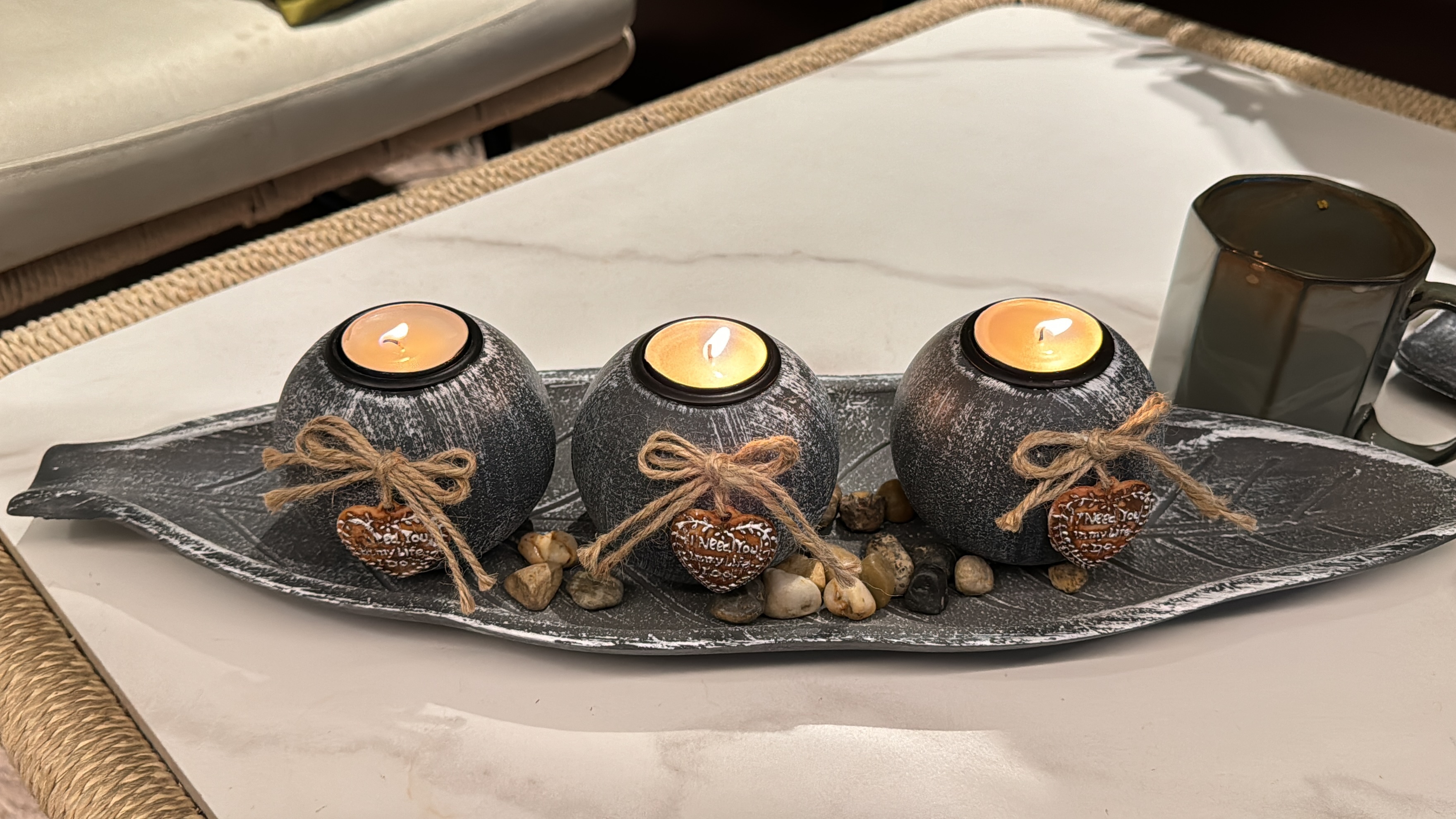 Ajoutez une touche chaleureuse et élégante à votre intérieur avec cet ensemble rustique de bougeoirs en bois pour bougies , montés sur un plateau en métal finition thermolaquée. Chaque bougeoir artisanal est orné d'une corde en chanvre naturelle et d'une étiquette décorative, pour une ambiance authentique et conviviale idéale sur une table, un bureau, ou comme centre de table à l’occasion d’un mariage, un anniversaire ou la fête des mères. Une idée cadeau originale pour mettre en valeur la déco de la maison ou offrir un présent qui fait plaisir : parfait pour une sœur, une maman, une amie, une enseignante ou votre moitié. Fabriqué en bois et métal robustes, ce trio de porte-bougies allie durabilité et charme rustique, tout en s’intégrant à tous les styles d’intérieur grâce à son design intemporel. Plateau de 50 cm, trois photophores en bois de 8 cm de hauteur et 9 cm de diamètre. Convient aux bougies chauffe-plat standard (non incluses). Offrez-vous ou faites plaisir avec ce set de bougeoirs décoratifs de bienvenue ou de partage pour toutes les occasions spéciales !