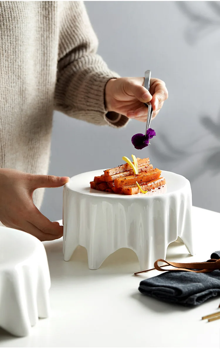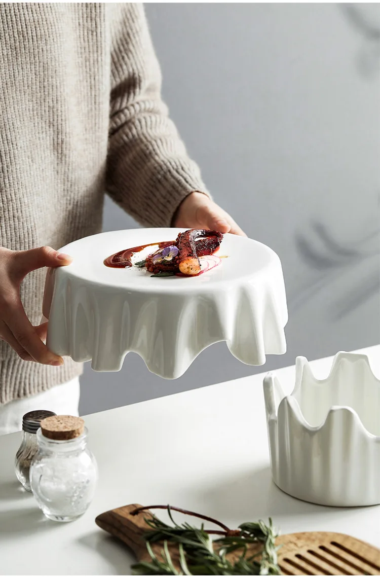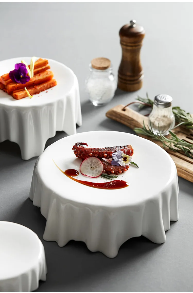 Assiettes hautes blanches en porcelaine premium, effet drapé élégant, parfaites pour une table moderne et raffinée.