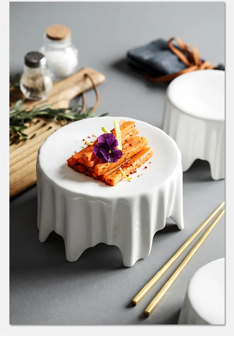 Assiette blanche, vaisselle pour hôtel et maison, conception créative de cuisine, plat artistique, vaisselle ronde.